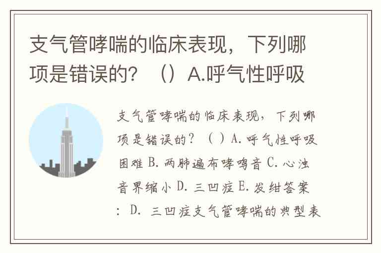 支气管哮喘的临床表现,下列哪项是错误的?()A.呼气性呼吸困难 B.两肺遍布哮鸣音 C.心浊音界缩小 D.三凹症 E.发绀