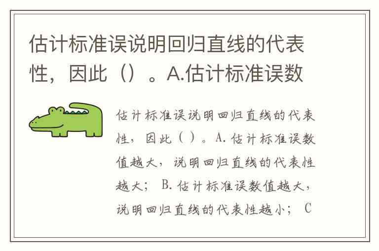 估计标准误说明回归直线的代表性,因此()。A.估计标准误数值越大,说明回归直线的代表性越大; B.估计标准误数值越大,说明回归直线的代表性越小; C.估计标准误数值越小,说明回归直线的代表性越小; D.估计标准误数值越小,说明回归直线的实用价值越小