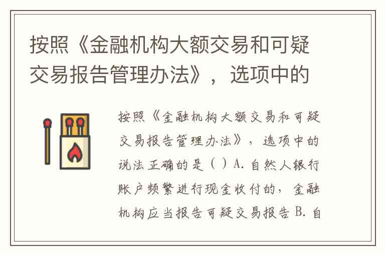 按照《金融机构大额交易和可疑交易报告管理办法》,选项中的说法正确的是()A.自然人银行账户频繁进行现金收付的,金融机构应当报告可疑交易报告 B.自然人银行账户一次性大额存取现金,金融机构应当报告可疑交易报告 C.自然人客户短期内频繁收取法人、其他组织汇款的,金融机构应当报告可疑交易报告 D.自然人经常存入境外开立的旅行支票的,金融机构应当报告可疑交易报告