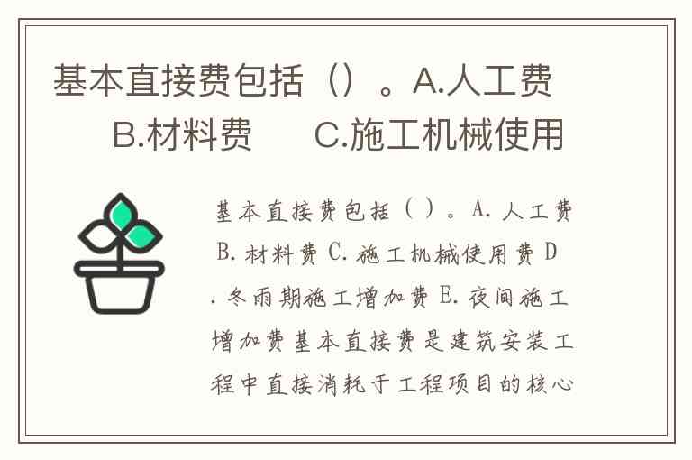 基本直接费包括()。A.人工费 B.材料费 C.施工机械使用费 D.冬雨期施工增加费 E.夜间施工增加费