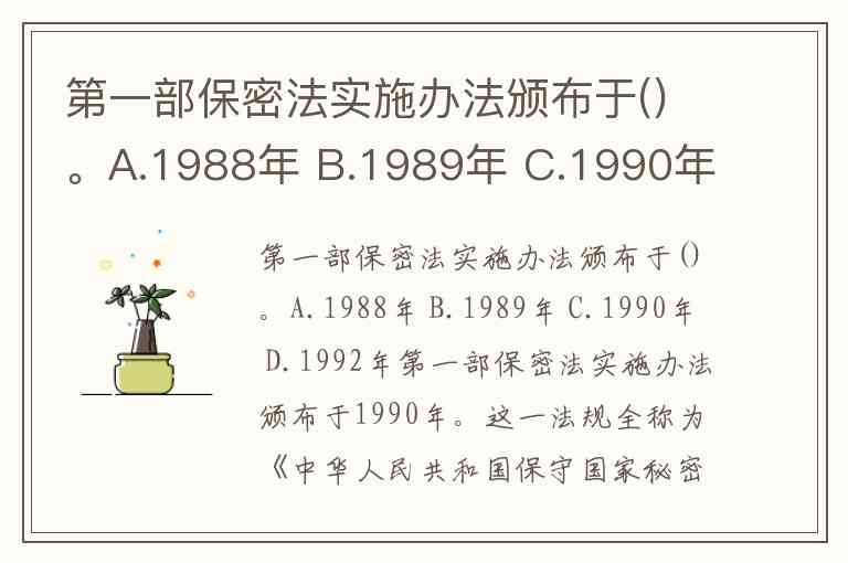 第一部保密法实施办法颁布于()。A.1988年 B.1989年 C.1990年 D.1992年