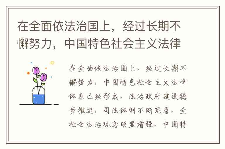 在全面依法治国上,经过长期不懈努力,中国特色社会主义法律体系已经形成,法治政府建设稳步推进,司法体制不断完善,全社会法治观念明显增强,中国特色社会主义法治取得历史性成就。