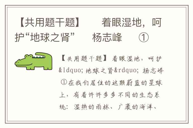 标题“着眼湿地,呵护‘地球之肾’”运用了打比方(比喻)的说明方法,将湿地比作“地球之肾”。这种修辞通过人体器官“肾”的功能特征,直观揭示了湿地的核心生态价值——如同肾脏调节人体水分、过滤废物一般,湿地能通过蓄水调洪、净化水质等作用维持地球生态系统的平衡。