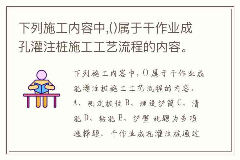 下列施工内容中,()属于干作业成孔灌注桩施工工艺流程的内容。A、测定桩位 B、埋设护筒 C、清孔 D、钻孔 E、护壁 此题为多项选择题。