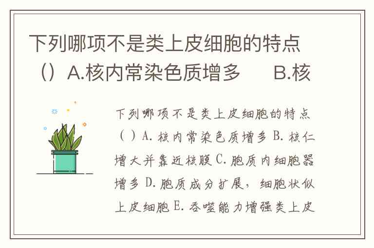 下列哪项不是类上皮细胞的特点()A.核内常染色质增多 B.核仁增大并靠近核膜 C.胞质内细胞器增多 D.胞质成分扩展,细胞状似上皮细胞 E.吞噬能力增强