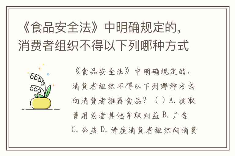 《食品安全法》中明确规定的,消费者组织不得以下列哪种方式向消费者推荐食品?()A.收取费用或者其他牟取利益 B.广告 C.公益 D.讲座