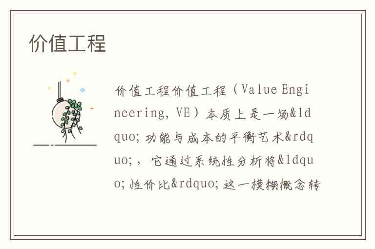 价值工程(Value Engineering, VE)本质上是一场“功能与成本的平衡艺术”,它通过系统性分析将“性价比”这一模糊概念转化为可量化、可优化的管理技术。1947年由美国通用电气工程师劳伦斯·麦尔斯创立时,其核心洞见就颠覆了传统思维——人们购买的不是产品本身,而是产品所提供的功能。这个被浓缩为公式 V=F/C(价值=功能/成本)的智慧,至今仍在重塑从汽车设计到建筑工程的各个领域[2]。