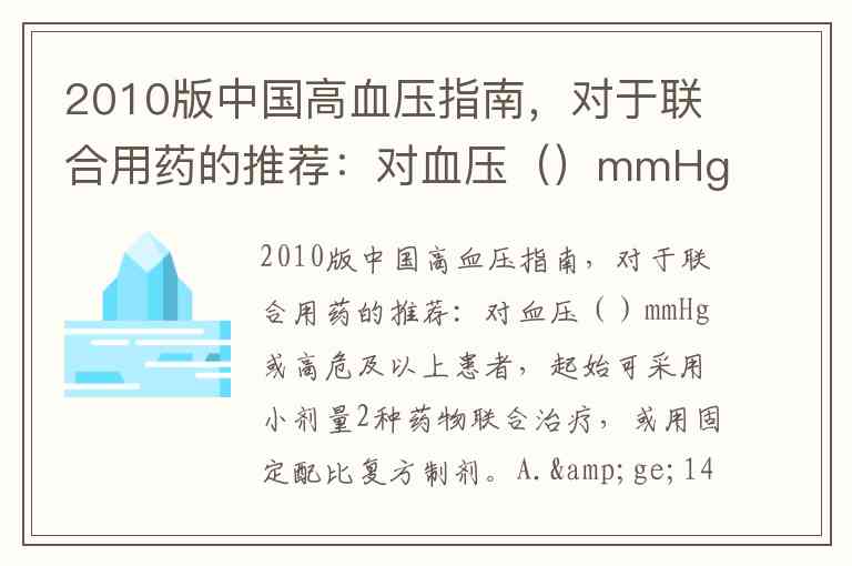 2010版中国高血压指南,对于联合用药的推荐:对血压()mmHg或高危及以上患者,起始可采用小剂量2种药物联合治疗,或用固定配比复方制剂。A.≥140/90 B.≥150/90 C.≥160/100 D.≥180/110