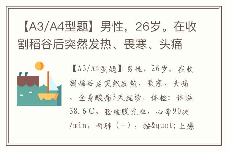 【A3/A4型题】男性,26岁。在收割稻谷后突然发热、畏寒、头痛、全身酸痛3天就诊。体检:体温38.6℃,睑结膜充血,心率90次/min,两肺(-),按"上感"治疗,3天后症状未见好转,化验:WBC21.6×109/L,N0.90(90%),血清凝集溶解试验效价1:400,诊断为钩端螺旋体病。钩端螺旋体病主要临床表现是()A.长期发热、皮肤黄染 B.发热、头痛、鼻塞、咳嗽 C.发热、皮肤黄染,浅表淋巴结肿大 D.发热、恶心、呕吐,皮肤瘀点 E.发热、头痛、结合膜充血,腓肠肌疼痛