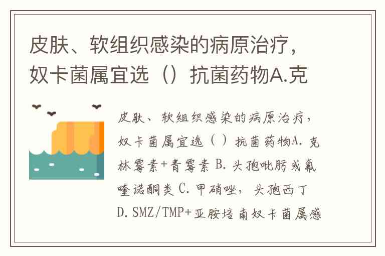 皮肤、软组织感染的病原治疗,奴卡菌属宜选()抗菌药物A.克林霉素+青霉素 B.头孢吡肟或氟喹诺酮类 C.甲硝唑,头孢西丁 D.SMZ/TMP+亚胺培南