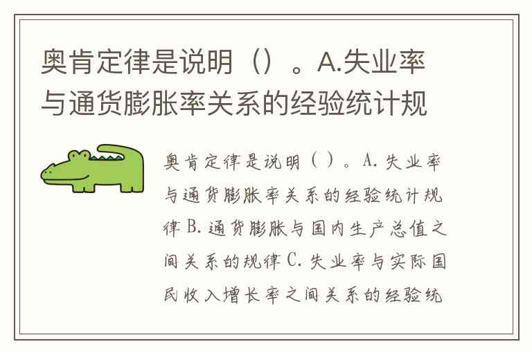 奥肯定律是说明()。A.失业率与通货膨胀率关系的经验统计规律 B.通货膨胀与国内生产总值之间关系的规律 C.失业率与实际国民收入增长率之间关系的经验统计规律 D.人口增长率与失业优选法之间关系的统计规律