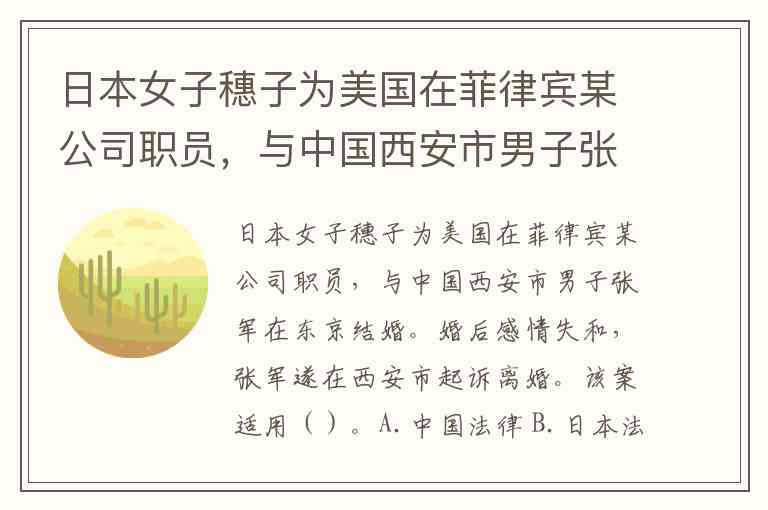 日本女子穗子为美国在菲律宾某公司职员,与中国西安市男子张军在东京结婚。婚后感情失和,张军遂在西安市起诉离婚。该案适用()。A.中国法律 B.日本法律 C.美国法律 D.菲律宾法律