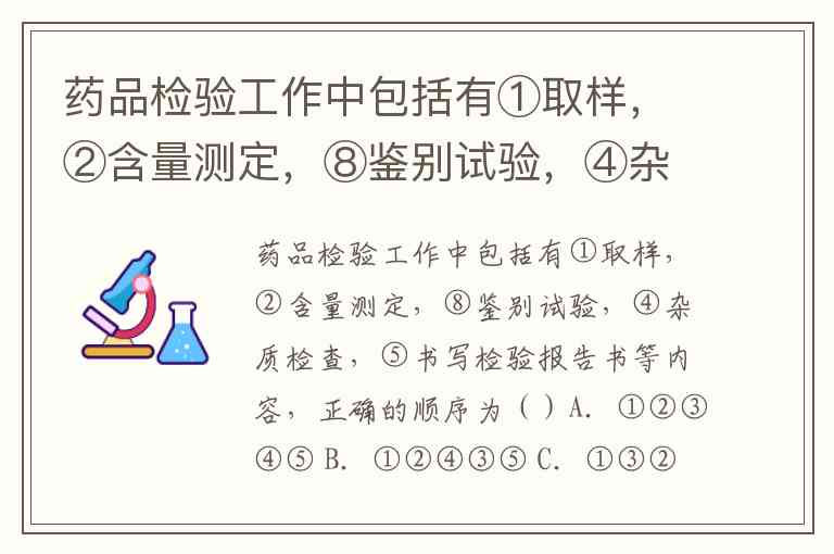 药品检验工作中包括有①取样,②含量测定,⑧鉴别试验,④杂质检查,⑤书写检验报告书等内容,正确的顺序为()A.①②③④⑤ B.①②④③⑤ C.①③②④⑤ D.①④②③⑤ E.①③④②⑤