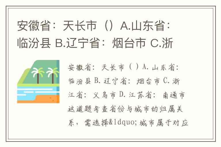 安徽省:天长市()A.山东省:临汾县 B.辽宁省:烟台市 C.浙江省:义乌市 D.江苏省:南通市