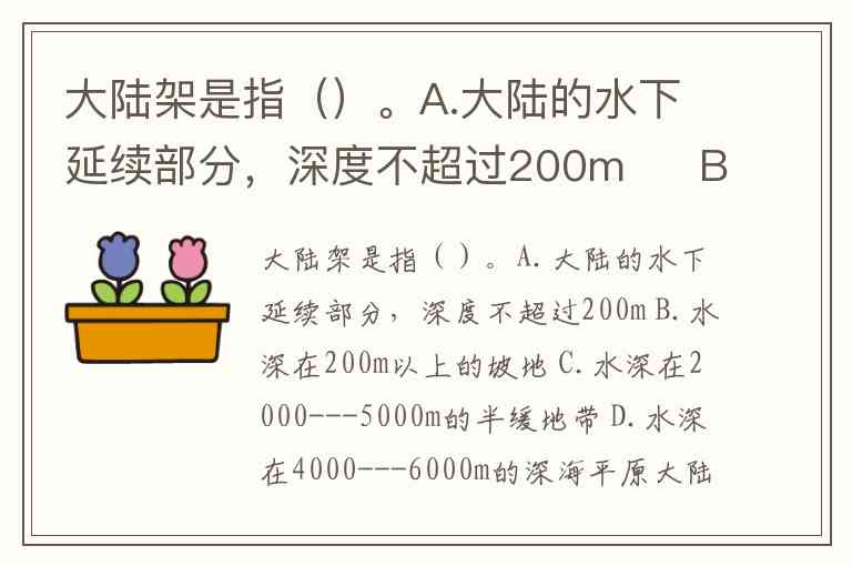 大陆架是指()。A.大陆的水下延续部分,深度不超过200m B.水深在200m以上的坡地 C.水深在2000---5000m的半缓地带 D.水深在4000---6000m的深海平原