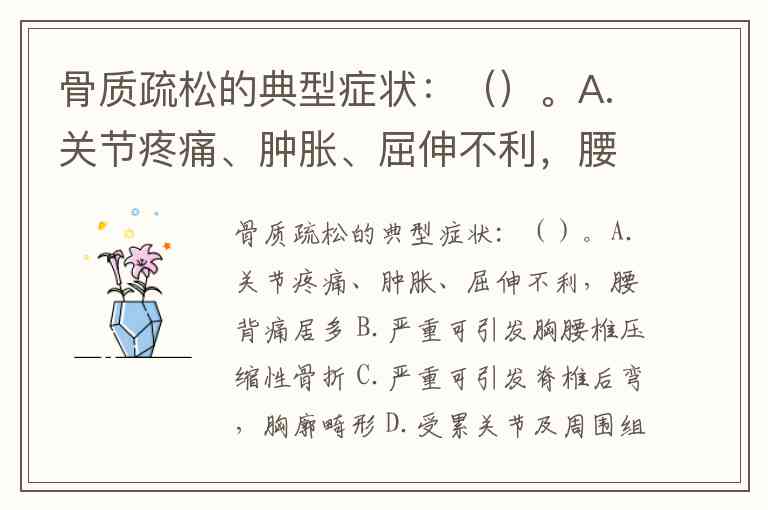 骨质疏松的典型症状:()。A.关节疼痛、肿胀、屈伸不利,腰背痛居多 B.严重可引发胸腰椎压缩性骨折 C.严重可引发脊椎后弯,胸廓畸形 D.受累关节及周围组织红、肿、热、痛和功能受限