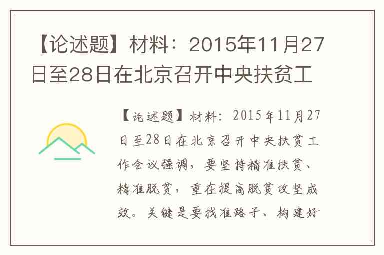 【论述题】材料:2015年11月27日至28日在北京召开中央扶贫工作会议强调,要坚持精准扶贫、精准脱贫,重在提高脱贫攻坚成效。关键是要找准路子、构建好的体制机制,在精准施策上出实招、出精准推进上下实功、在精准落地上见实效。要解决好“怎么扶”的问题,按照贫困地区和贫困人口的具体情况,实施“五个一批”工程:发展生产脱贫一批,易地搬迁脱贫一批,生态补偿脱贫一批,发展教育脱贫一批,社会保障兜底一批。分析政府应采取哪些措施来做到精准扶贫、精准脱贫。①就业是民生之本,以经济建设为中心,保证就业。 ②坚持和完善以公有制为主体、多种所有制经济共同发展基本经济制度;坚持以按劳分配为主体,多种分配方式共存的分配制度。 ③提高国家最低工资标准,努力实现居民收入增长和经济发展同步、劳动报酬增长和劳动生产率提高同步。 ④再分配更注重公平,健全以税收、社会保障、转移支付为主要手段的再分配调节机制,兼顾公平与效率。