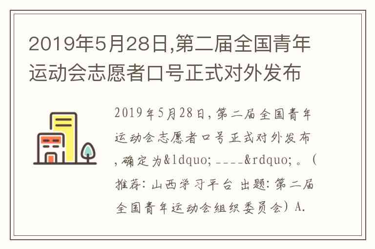 2019年5月28日,第二届全国青年运动会志愿者口号正式对外发布,确定为“____”。(推荐:山西学习平台 出题:第二届全国青年运动会组织委员会) A. 奉献二青,精彩三晋 B. 青春的约会,拼搏的舞台 C. 开放山西,开心青运 D. 逐梦山西,乐享青运