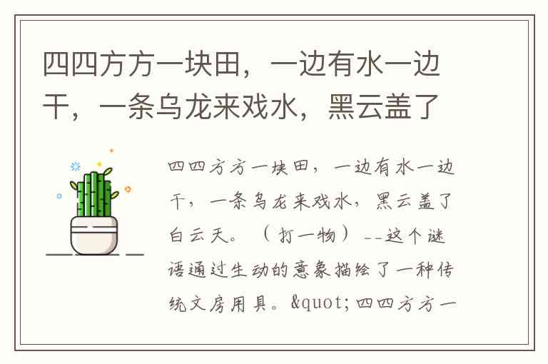 这个谜语通过生动的意象描绘了一种传统文房用具。"四四方方一块田"指向其方形外观;"一边有水一边干"暗示功能分区——湿润的墨池与干燥的台面相隔;"乌龙戏水"形容黑色墨条在墨池中研磨的过程;"黑云盖白云天"则形象展现墨汁书写于宣纸的效果。