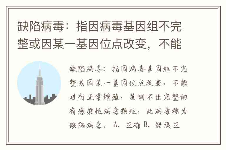 缺陷病毒:指因病毒基因组不完整或因某一基因位点改变,不能进行正常增殖,复制不出完整的有感染性病毒颗粒,此病毒称为缺陷病毒。 A. 正确 B. 错误