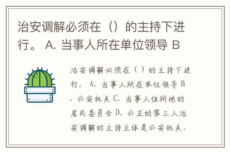 治安调解必须在()的主持下进行。 A. 当事人所在单位领导 B. 公安机关 C. 当事人住所地的居民委员会 D. 公正的第三人