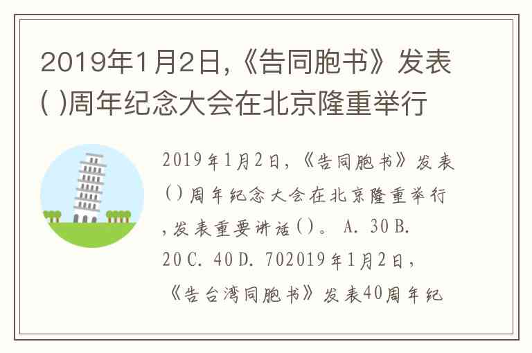 2019年1月2日,《告同胞书》发表( )周年纪念大会在北京隆重举行,发表重要讲话( )。 A. 30 B. 20 C. 40 D. 70