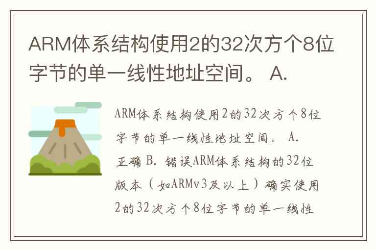综上,题目描述准确。现代ARM系统虽已发展出64位架构,但"ARM体系结构"的经典定义(32位版本)确实采用2³²字节的单一线性地址空间。这一设计奠定了嵌入式系统存储器管理的基础,至今仍是理解ARM架构的核心概念。