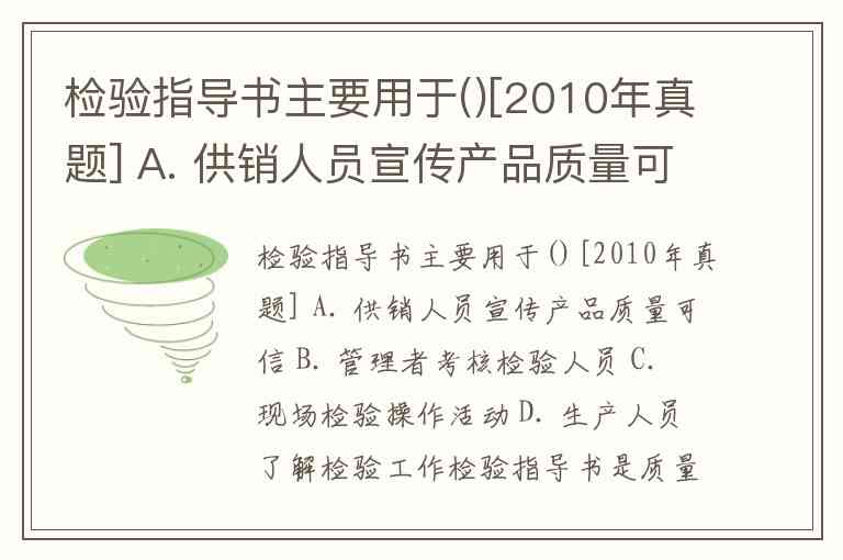 检验指导书主要用于()[2010年真题] A. 供销人员宣传产品质量可信 B. 管理者考核检验人员 C. 现场检验操作活动 D. 生产人员了解检验工作
