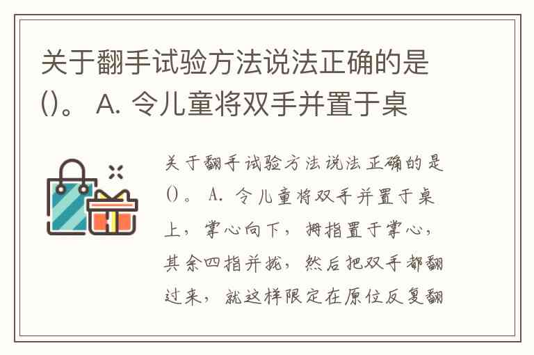 正确操作方法(对应选项A)需满足以下要素:儿童坐于桌前,双手掌向下平置于桌面,拇指沿桌边垂下(或置于掌心),其余四指并拢;在原位进行反复翻手动作并逐渐加速,过程中肘部应尽量减少摆动。阳性表现包括翻手姿势笨拙、手指不能并拢、肘部摆动幅度超过一个手臂宽度,或出现无规律乱翻现象。这一过程需排除刻意摆动肘部等干扰因素,以确保结果准确性。