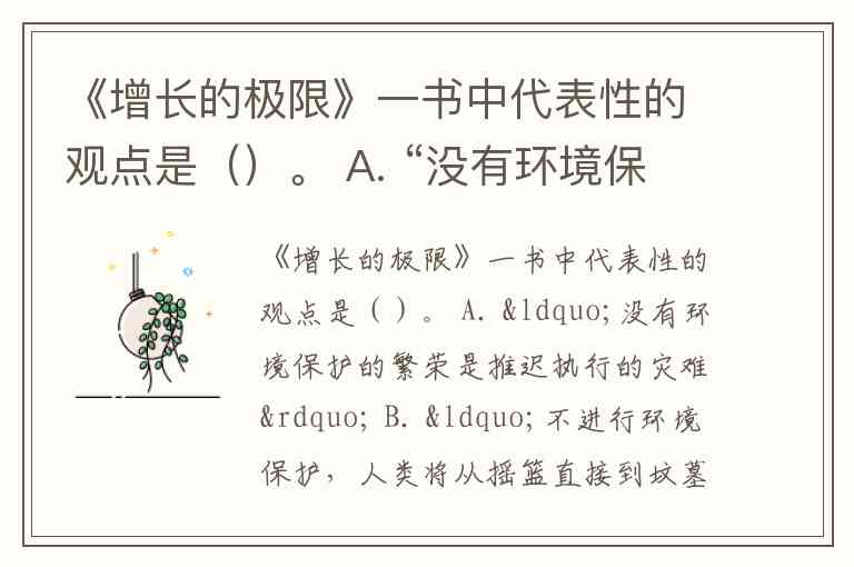 《增长的极限》一书中代表性的观点是()。 A. “没有环境保护的繁荣是推迟执行的灾难” B. “不进行环境保护,人类将从摇篮直接到坟墓” C. “不解决环境问题,人类将生活在幸福的坟墓中” D. “科学发展观”