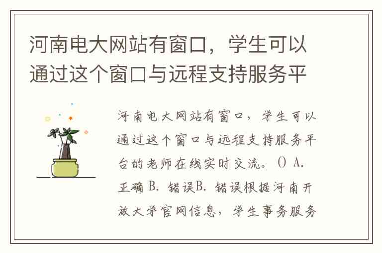 河南电大网站有窗口,学生可以通过这个窗口与远程支持服务平台的老师在线实时交流。() A. 正确 B. 错误