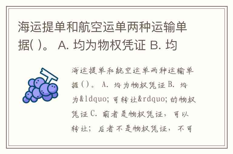 海运提单和航空运单两种运输单据( )。 A. 均为物权凭证 B. 均为“可转让”的物权凭证 C. 前者是物权凭证,可以转让;后者不是物权凭证,不可转让 D. 前者不是物权凭证,不得转让;后者是物权凭证,可转让