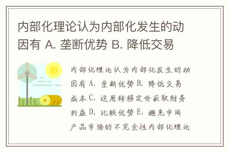 内部化理论认为内部化发生的动因有 A. 垄断优势 B. 降低交易成本 C. 运用转移定价获取财务利益 D. 比较优势 E. 避免中间产品市场的不完全性