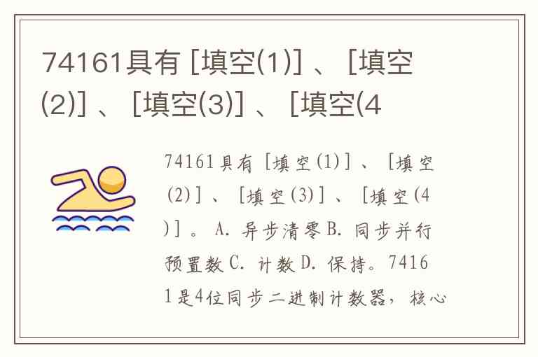 74161具有 [填空(1)] 、 [填空(2)] 、 [填空(3)] 、 [填空(4)] 。 A. 异步清零 B. 同步并行预置数 C. 计数 D. 保持。