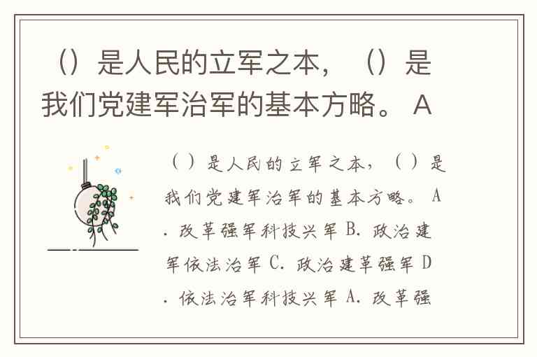 ()是人民的立军之本,()是我们党建军治军的基本方略。 A. 改革强军科技兴军 B. 政治建军依法治军 C. 政治建革强军 D. 依法治军科技兴军 A. 改革强军 科技兴军 B. 政治建军 依法治军 C. 政治建军 改革强军 D. 依法治军 科技兴军