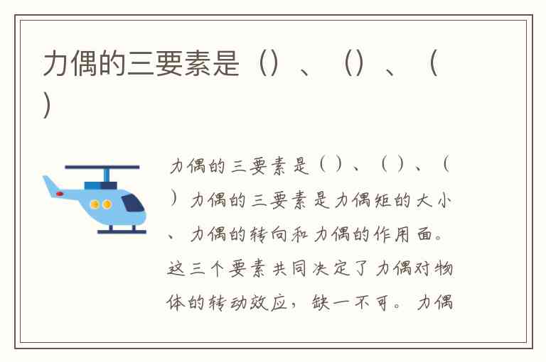 力偶的三要素是力偶矩的大小、力偶的转向和力偶的作用面。这三个要素共同决定了力偶对物体的转动效应,缺一不可。