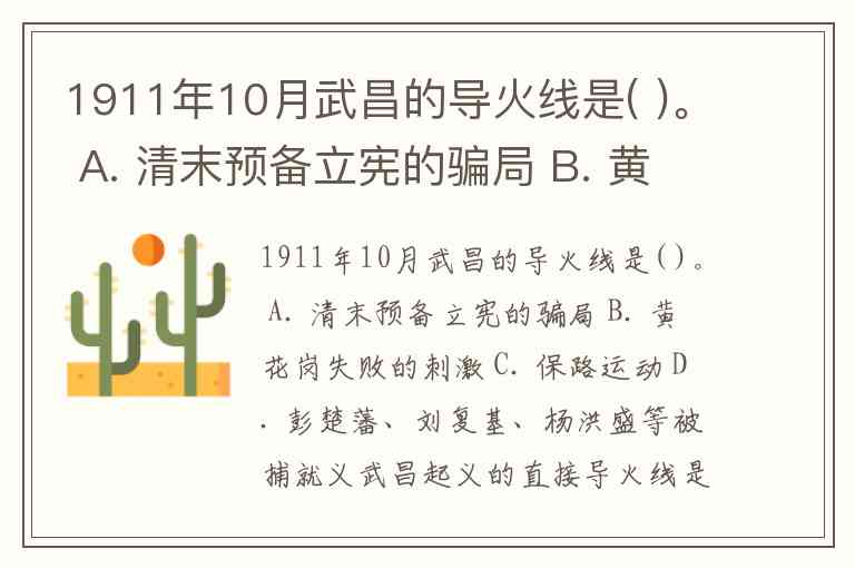 1911年10月武昌的导火线是( )。 A. 清末预备立宪的骗局 B. 黄花岗失败的刺激 C. 保路运动 D. 彭楚藩、刘复基、杨洪盛等被捕就义