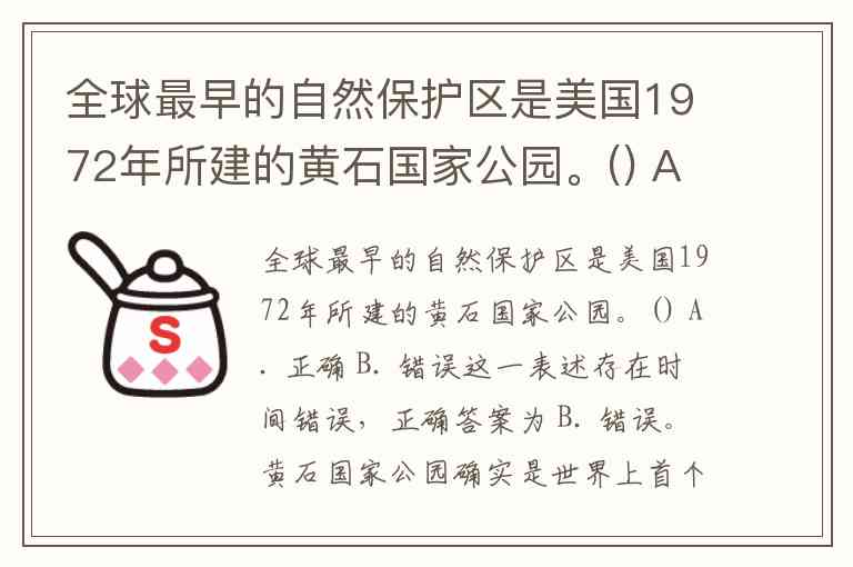 这一表述存在时间错误,正确答案为 B. 错误。黄石国家公园确实是世界上首个由政府批准建立的国家公园,但其成立时间是 1872年,而非题目中所说的1972年。1872年3月1日,美国时任总统尤利西斯·辛普森·格兰特签署法案,正式设立黄石国家公园,使其成为全球自然保护史上的里程碑事件。