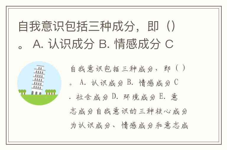 自我意识包括三种成分,即()。 A. 认识成分 B. 情感成分 C. 社会成分 D. 环境成分 E. 意志成分