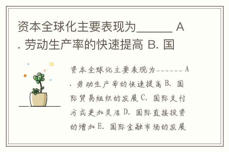 资本全球化主要表现为______ A. 劳动生产率的快速提高 B. 国际贸易组织的发展 C. 国际支付方式更加灵活 D. 国际直接投资的增加 E. 国际金融市场的发展
