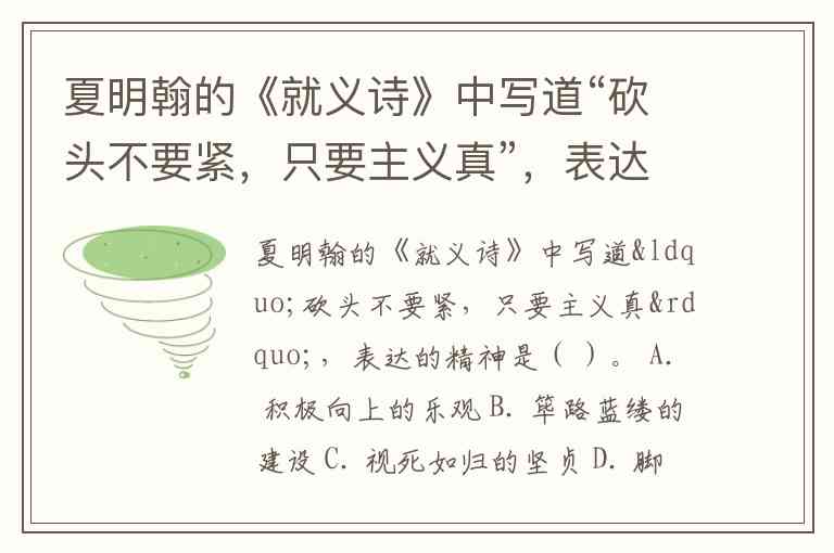 夏明翰的《就义诗》中写道“砍头不要紧,只要主义真”,表达的精神是( )。 A. 积极向上的乐观 B. 筚路蓝缕的建设 C. 视死如归的坚贞 D. 脚踏实地的奋斗