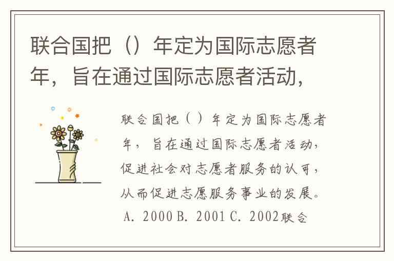 联合国把()年定为国际志愿者年,旨在通过国际志愿者活动,促进社会对志愿者服务的认可,从而促进志愿服务事业的发展。 A. 2000 B. 2001 C. 2002