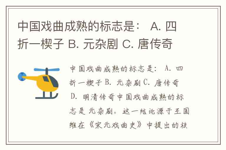 中国戏曲成熟的标志是: A. 四折一楔子 B. 元杂剧 C. 唐传奇 D. 明清传奇