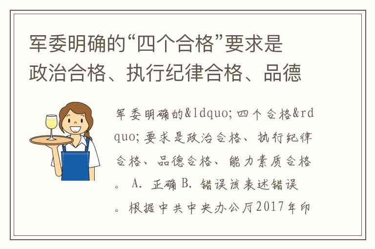 军委明确的“四个合格”要求是政治合格、执行纪律合格、品德合格、能力素质合格。 A. 正确 B. 错误