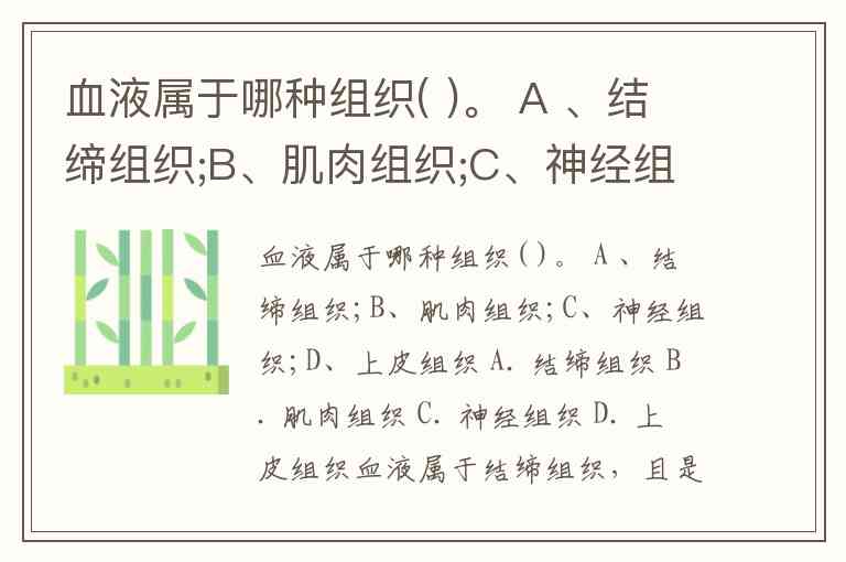 血液属于哪种组织( )。 A 、结缔组织;B、肌肉组织;C、神经组织;D、上皮组织 A. 结缔组织 B. 肌肉组织 C. 神经组织 D. 上皮组织
