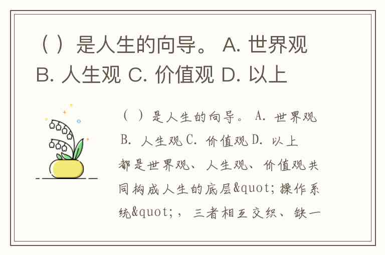 ( )是人生的向导。 A. 世界观 B. 人生观 C. 价值观 D. 以上都是