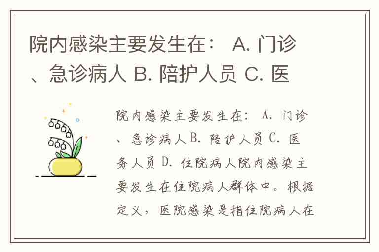院内感染主要发生在: A. 门诊、急诊病人 B. 陪护人员 C. 医务人员 D. 住院病人