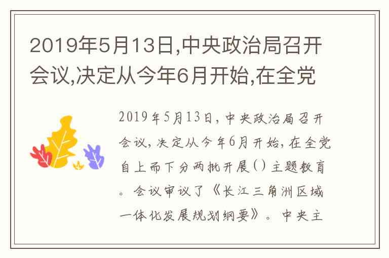 2019年5月13日,中共中央政治局召开会议,决定从当年6月开始在全党自上而下分两批开展“不忘初心、牢记使命”主题教育,这一部署与党的十九大精神一脉相承,旨在以县处级以上领导干部为重点,用习近平新时代中国特色社会主义思想武装全党。作为中华人民共和国成立70周年之际的重大政治任务,此次主题教育被定位为党中央统揽“四个伟大”的战略举措,对推进党的自我革命、实现“两个一百年”奋斗目标具有深远意义。