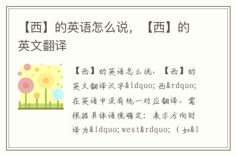 汉字“西”在英语中没有统一对应翻译,需根据具体语境确定:表示方向时译为“west”(如“西方”);表示“西班牙”时缩写为“Espana”或直接用“Spain”;在“西瓜”等合成词中保留音译“xi”(如“xigua”)。学习时最好结合完整词语记忆,比如“西北”是“northwest”,“西服”是“Western-style suit”。你是在什么具体语境中遇到这个字的呢?