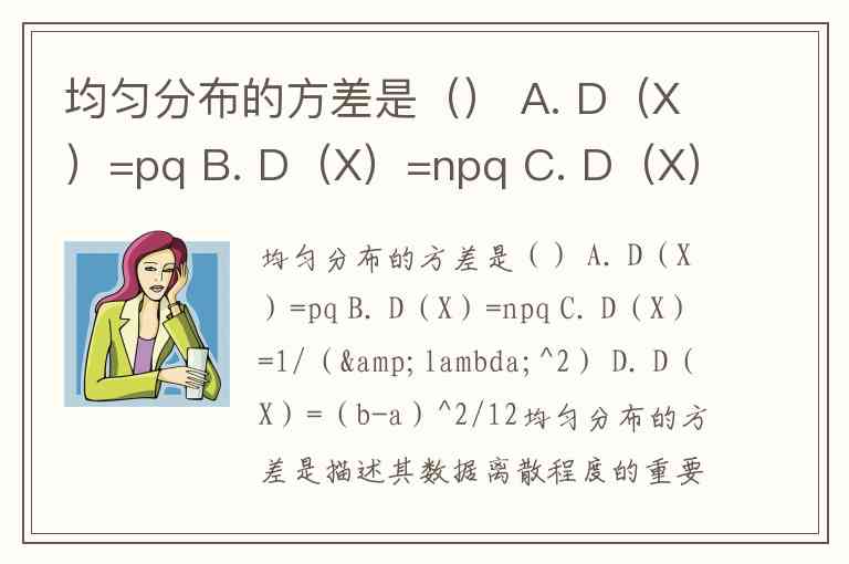 均匀分布的方差是() A. D(X)=pq B. D(X)=npq C. D(X)=1/(λ^2) D. D(X)=(b-a)^2/12